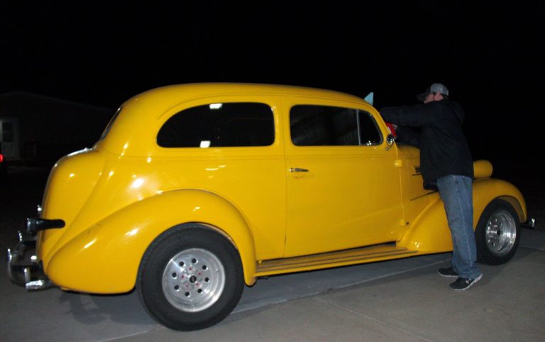 David Mead, of Ensign, polishes his Competition Yellow 1937 Chevy Master, known as "Woodstock," at his shop in anticipation for the Winter Wheel exhibition at the Western State Bank Expo Center this Jan. 17-19. [WHITNEY CARTER/DODGE CITY DAILY GLOBE] / Dodge City Daily Globe