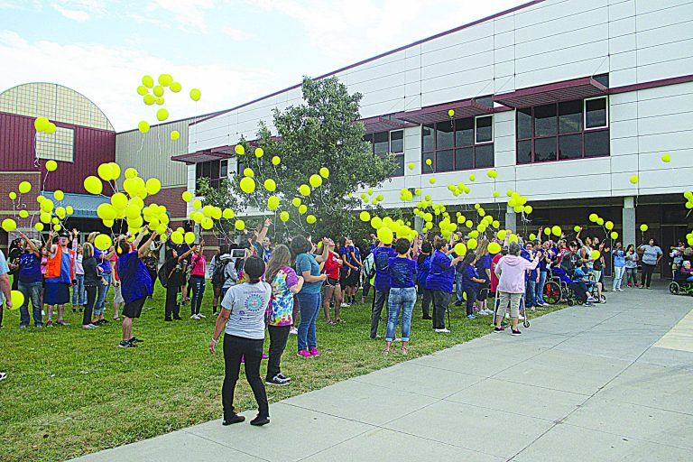 Students, teachers, community members released yellow balloons at Dodge City High School Thursday in remembrance of those who have died too soon as part of Suicide Prevention Week. PHOTO BY VINCENT MARSHALL/STAFF PHOTOGRAPHER / Dodge City Daily Globe