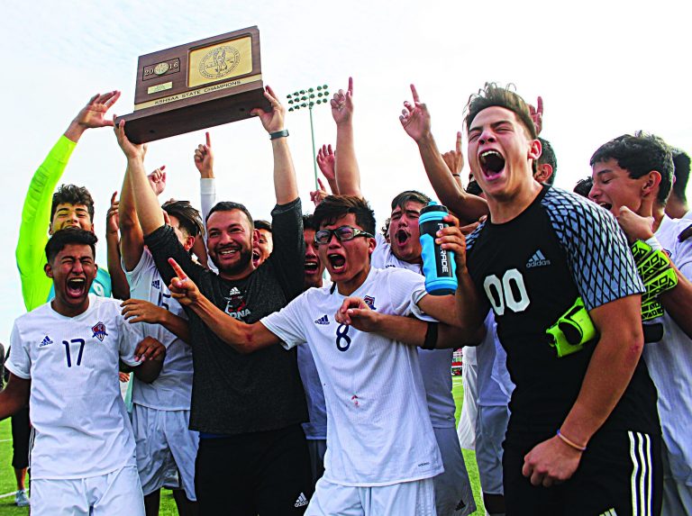 Dodge City High School head soccer coach Saul Hernandez, in center, hoists the 6A state championship trophy after the Red Demons 1-0 win over Olathe East on Saturday in Wichita. PHOTO BY JOHN ZETMEIR/DODGE CITY DAILY GLOBE / Dodge City Daily Globe