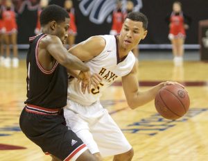 Leavenworth sophomore Reece Williams (33) drives toward the basket in the team's Tournament of Champions game Friday against the Manhattan Indians. SHELTON BURCH/STAFF PHOTOGRAPHER / Dodge City Daily Globe