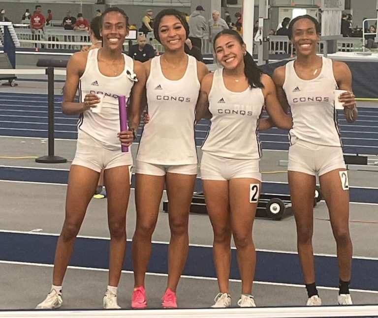 Dodge City CC women’s distance medley relay team posted a time of 12:56.50 at the Ichabod Invitational to qualify for NJCAA Indoor National Championships. Ava Washington, Bianca Gleim, Sarai Chavez and Ivy Washington.[PHOTO BY Dodge City CC Athletics]