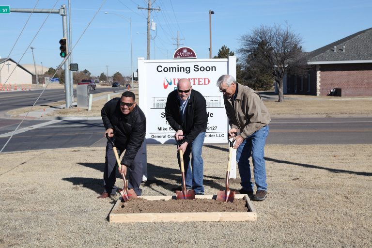 Ric Marboeuf, owner of M.R. Builder, LLC and ScooterþÄôs Coffee Franchisee; Todd Houseman, General Manager and CEO of United Telephone/United Wireless; Harry Walker and President of the United Telephone/United Wireless Board of Trustees break ground on United Plaza in Dodge City in February. SUBMITTED PHOTO / Dodge City Daily Globe