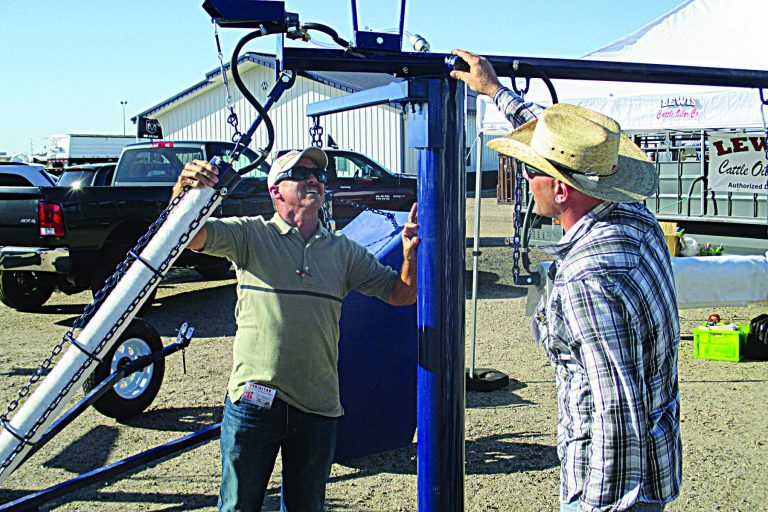 MB Enterprise CEO Bryan McPhail (left) shows off the Lewis Cattle Oiler at the annual 3i SHOW Thursday. PHOTO BY VINCENT MARSHALL/STAFF PHOTOGRAPHER / Dodge City Daily Globe